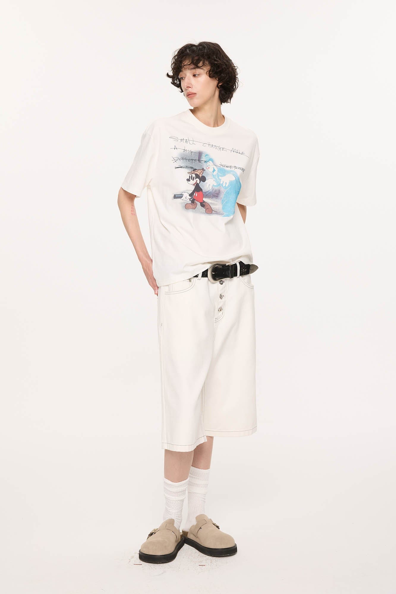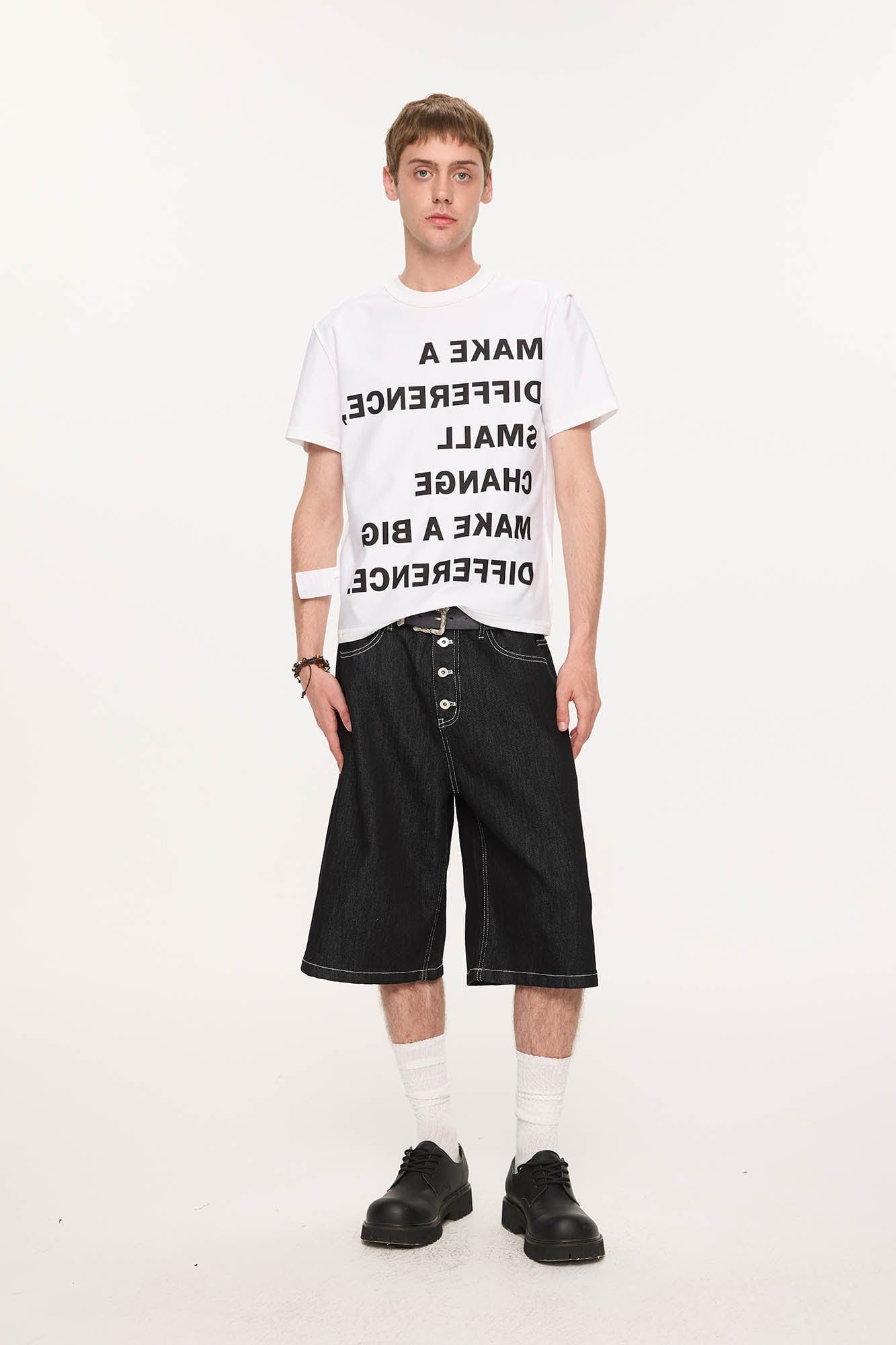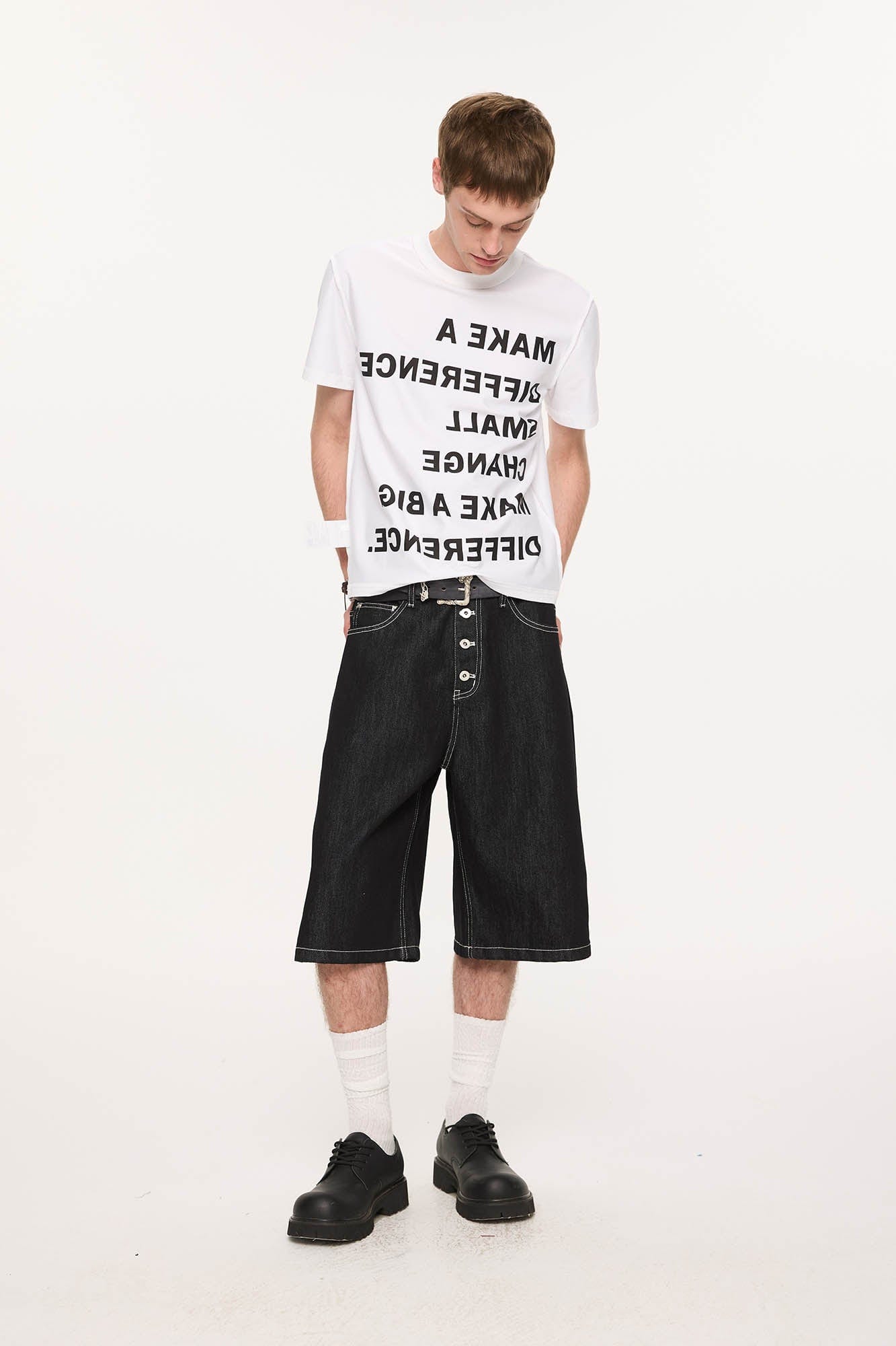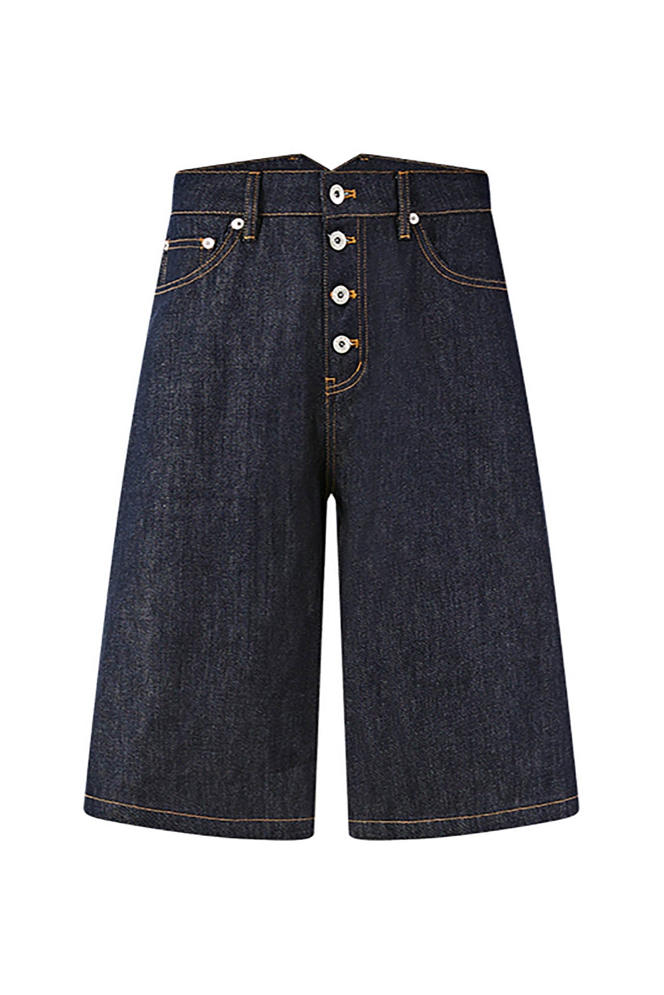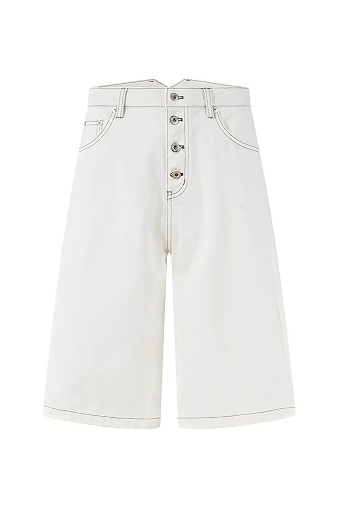 A nod to utilitarian tailoring with modern proportions, these oversized denim shorts blend clean construction with standout stitchwork and vintage cues. Crafted from premium cotton denim, the design features a wide-legged silhouette and a prominent button fly that enhances its structured visual language. Bold contrast topstitching adds a sharp graphic dimension, offered across three washes—classic indigo, off-white, and raw black—each with distinct tonal detailing.